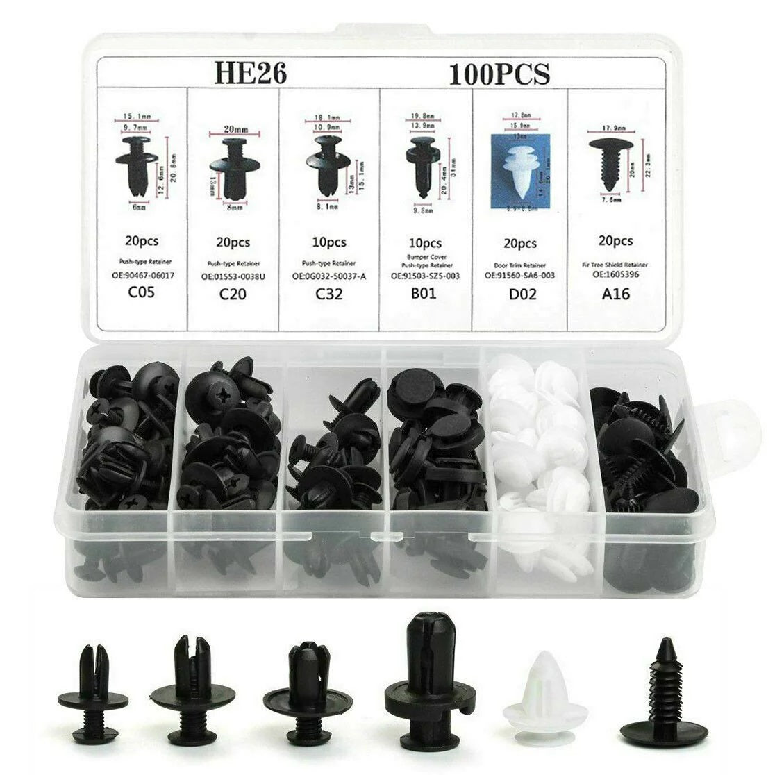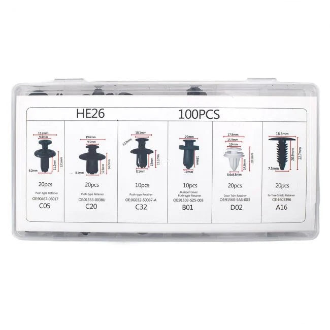Cu 100 de piese in set, veti avea o rezerva considerabila de clipsuri pentru viitoarele nevoi. Acest lucru este util in cazul in care trebuie sa inlocuiti sau sa fixati elemente deteriorate sau sa adaugati accesorii suplimentare in viitor.