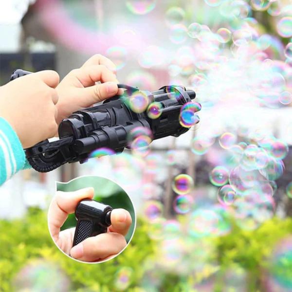 Foarte usor de utilizat, trebuie doar sa introduceti bateriile, sa reincarcati rezervorul cu lichid, sa apasati tragaciul si sa va distrati formand baloane de sapun