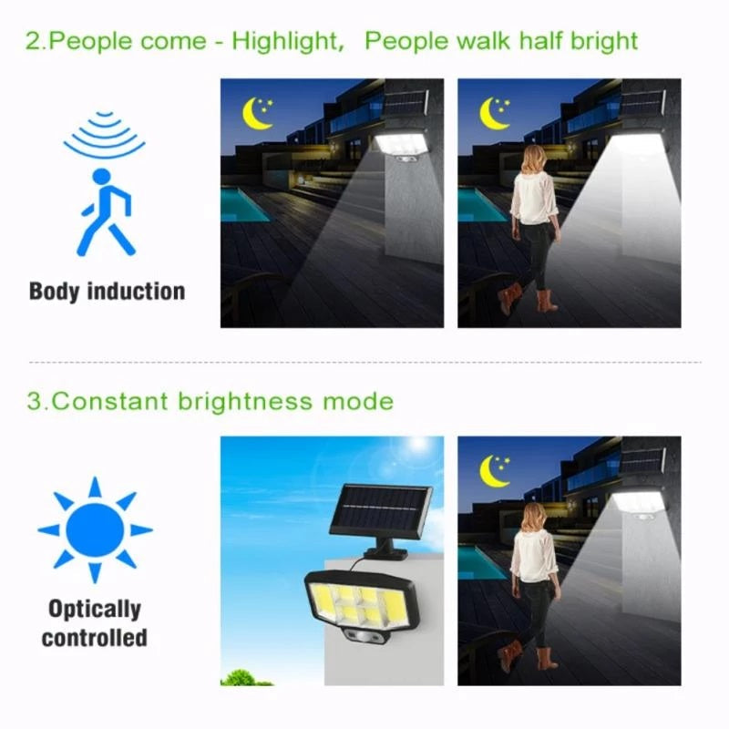 Lampa de perete cu energie solara 146LED, 3 moduri, senzor de miscare PIR, impermeabila, in aer liber, gradina, curte, veranda, securitate, iluminat stradal, rezistent la apa