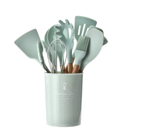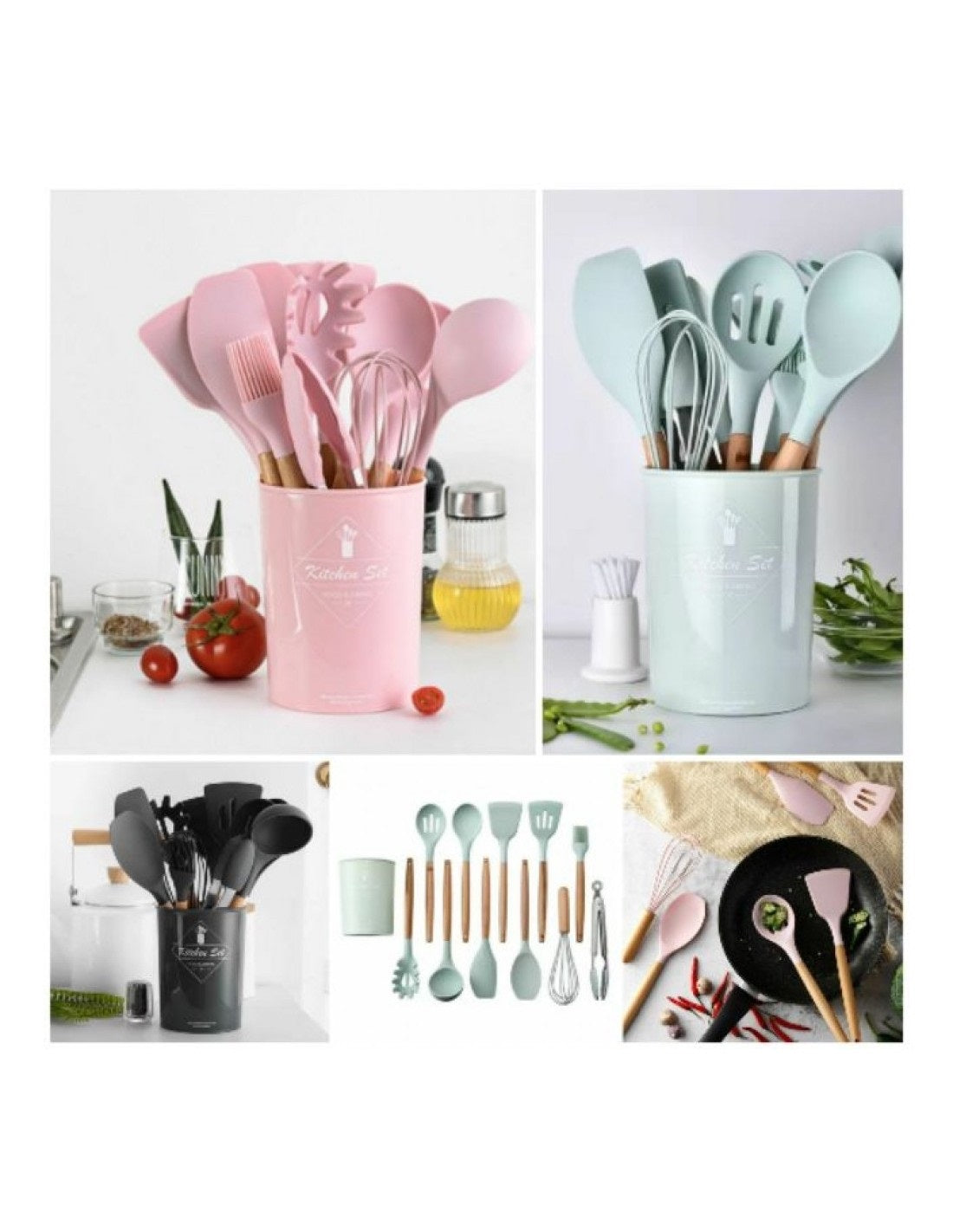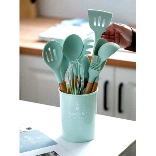 Set 12 ustensile de gatit din silicon, maner rezistent din bambus