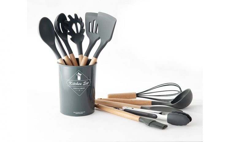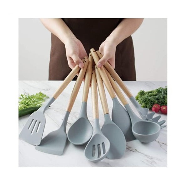 Set 13 ustensile de gatit din silicon, maner rezistent din bambus