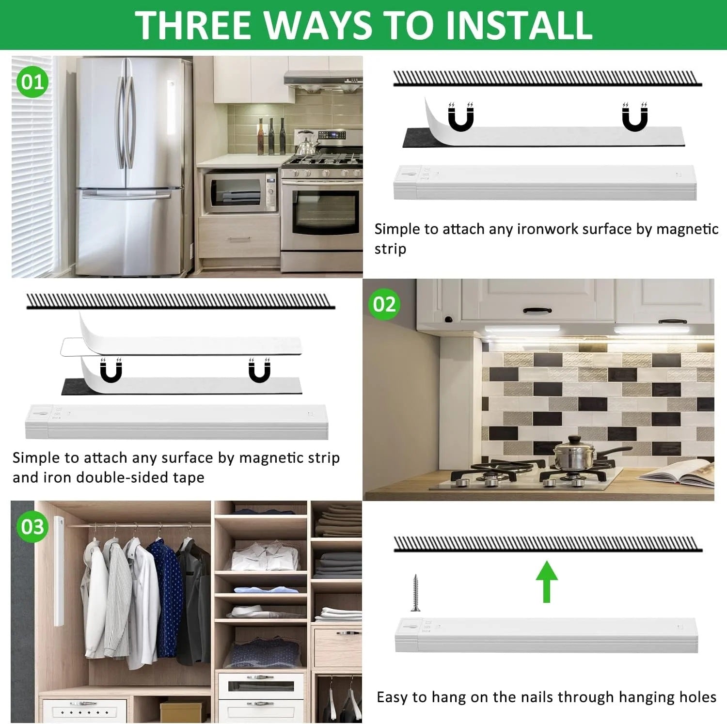 Aceasta Lampa LED cu sensor de miscare poate fi instalata cu usurinta folosind doar benzile magnetice fata-verso incluse, nu sunt necesare instrumente speciale.