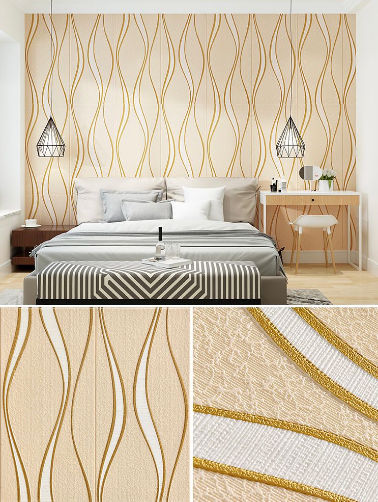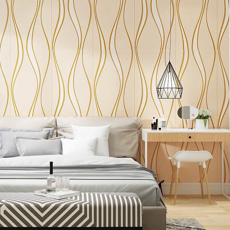 Set 5 x Tapet 3D Autoadeziv cu model bej cu fir auriu si alb, 68 cm x 68 cm x 6mm