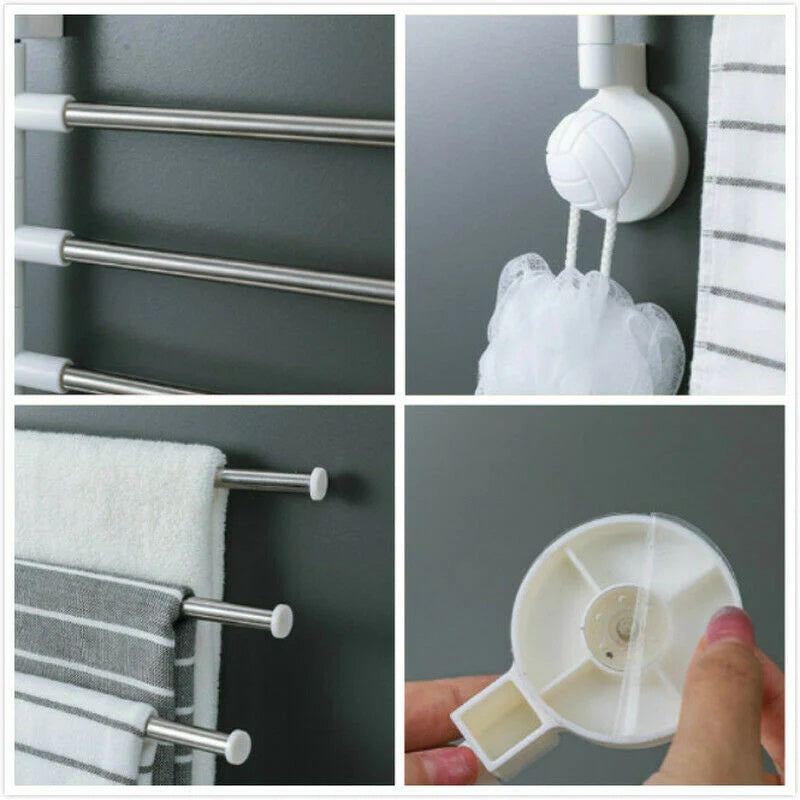 Acest suport cu ventuze pentru 4 prosoape este un accesoriu practic pentru baie sau bucatarie, proiectat pentru a va ajuta sa organizati si sa pastrati prosoapele intr-un mod ordonat si eficient.
